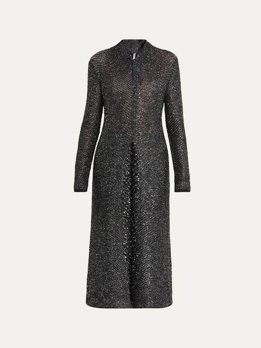 This Giorgio Armani sweater is crafted in a textured doublestitched knit, shimmering with metallic fibers, integrated sequins, and jeweled buttons V neckline Button front Long sleeves Center front slit Hem falls below the knee Straight silhouette Viscose/nylon/polyamide/metallic fibers Made in Italy