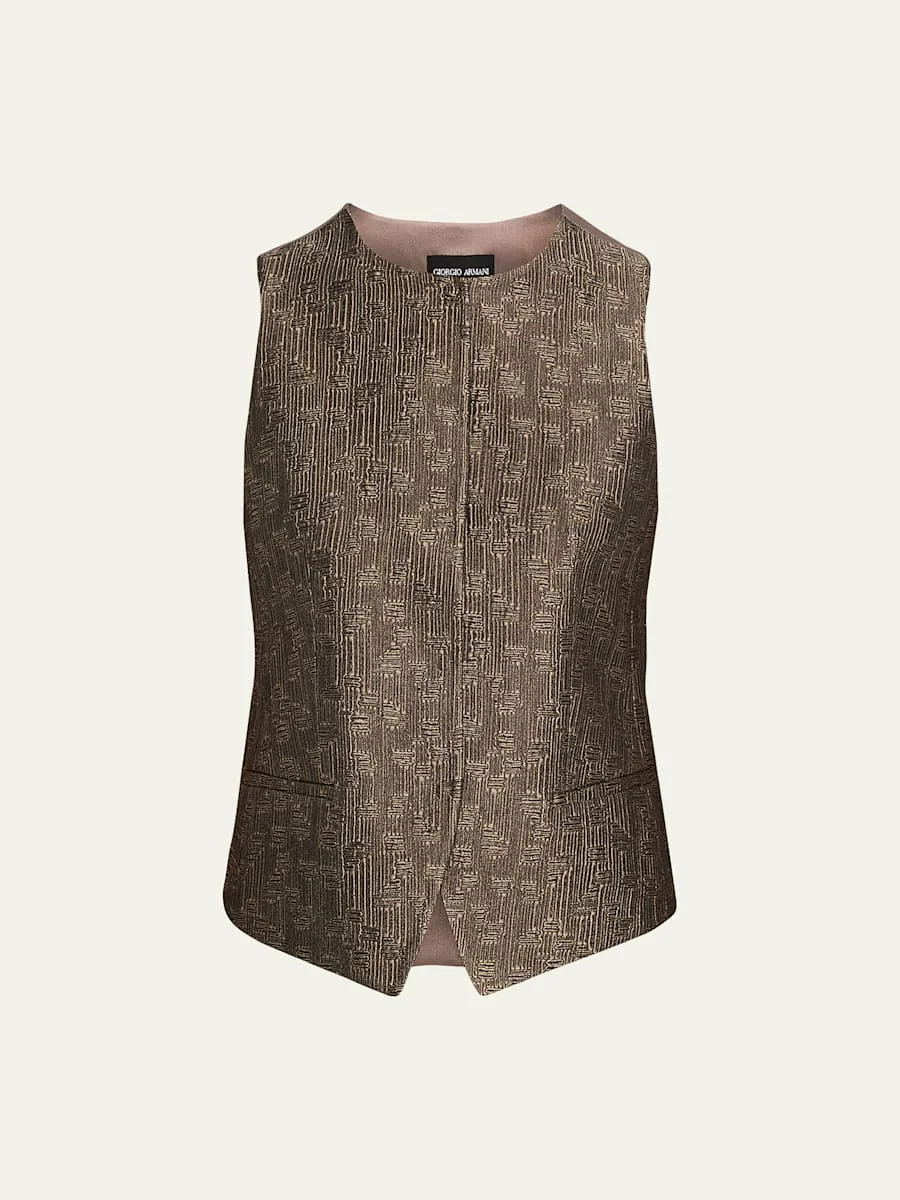 This Giorgio Armani waistcoat presents a sophisticated play on texture, featuring a richly patterned jacquard front and a sleek, smooth contrast back. This refined piece is masterfully woven from a luxurious blend of silk and wool. Crew neckline Concealed button front Sleeveless Hip welt pockets Slim fit Mulberry silk/virgin wool Lining: Mulberry silk Made in Italy SIZE amp; FITModel measurements: 5'10" tall Model is wearing a US size 4/Small