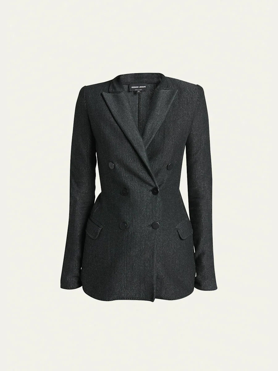 Giorgio Armani jersey jacquard blazer Peak lapels; double-breasted Long sleeves Hip flap pockets Tailored fit Back walking vent Nylon/polyamide/elastane/cotton Dry clean Made in Italy Model is 5'10"/177cm. Online Inquiries: BGS21_B8Y56| Store Inquiries: #4690346
