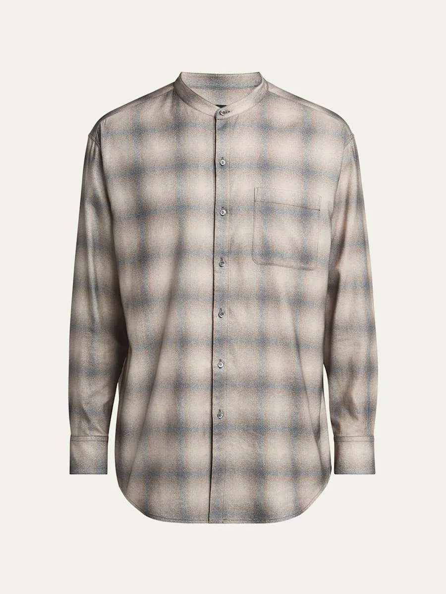 Men's Faded Plaid Cotton and Lyocell Nehru-Collar Sport Shirt
