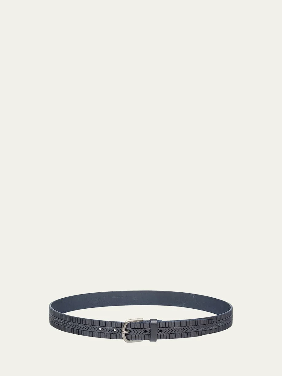 Giorgio Armani belt in textured calf leather defined by geometric engravings Approx. 1.2"W Pin buckle with an antique effect Leather loop Adjustable fit Leather Made in Italy Online Inquiries: BGS21_NDMSN| Store Inquiries: #5050553