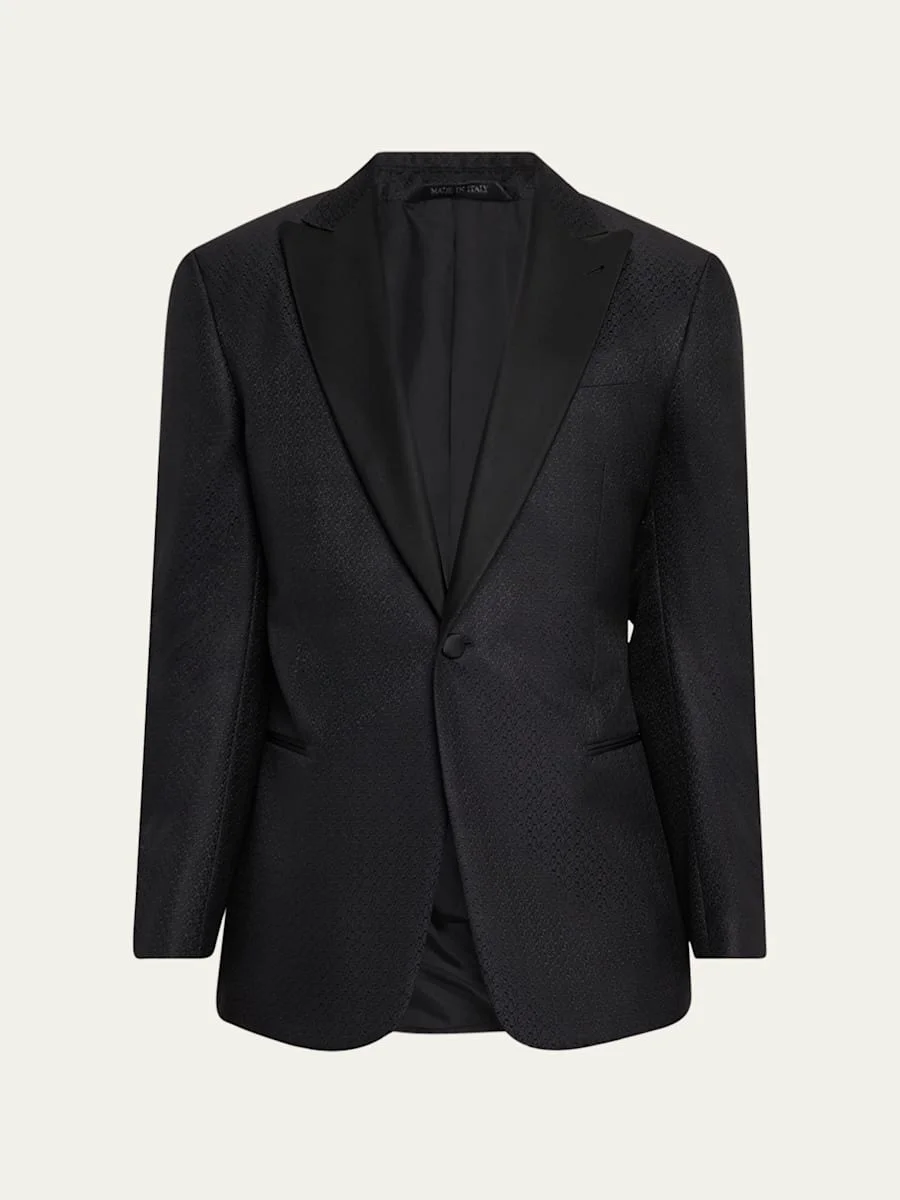 Giorgio Armani soft dinner jacket showcasing a honeycomb texture for unique dimension Satin peak lapels Singlebreasted front Chest welt pocket Hip besom pockets Long sleeves Doublevented back Virgin wool/silk/polyester Dry clean Made in Italy