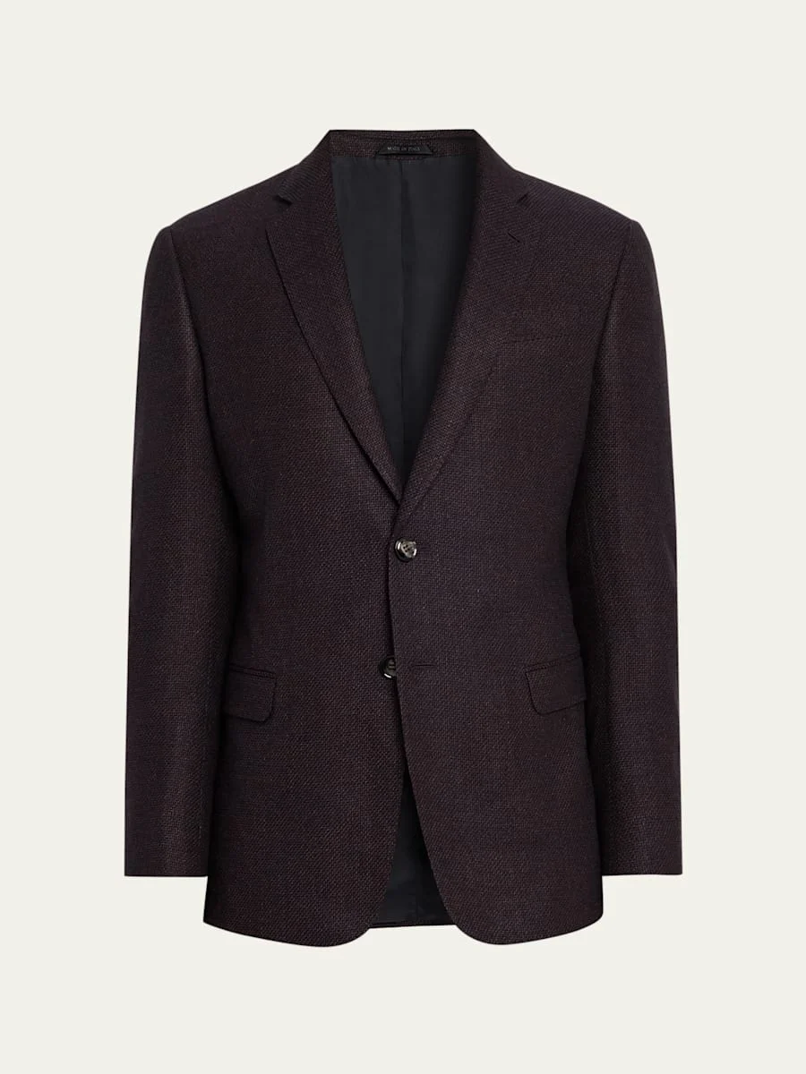 A blend of wool, silk, and linen creates a microgrid texture for this Giorgio Armani sport coat. Peak lapels Twobutton front Chest welt pocket Interior logo tag and pocket Side flap pockets Doublevented back Virgin wool/silk/linen Dry clean Made in Italy