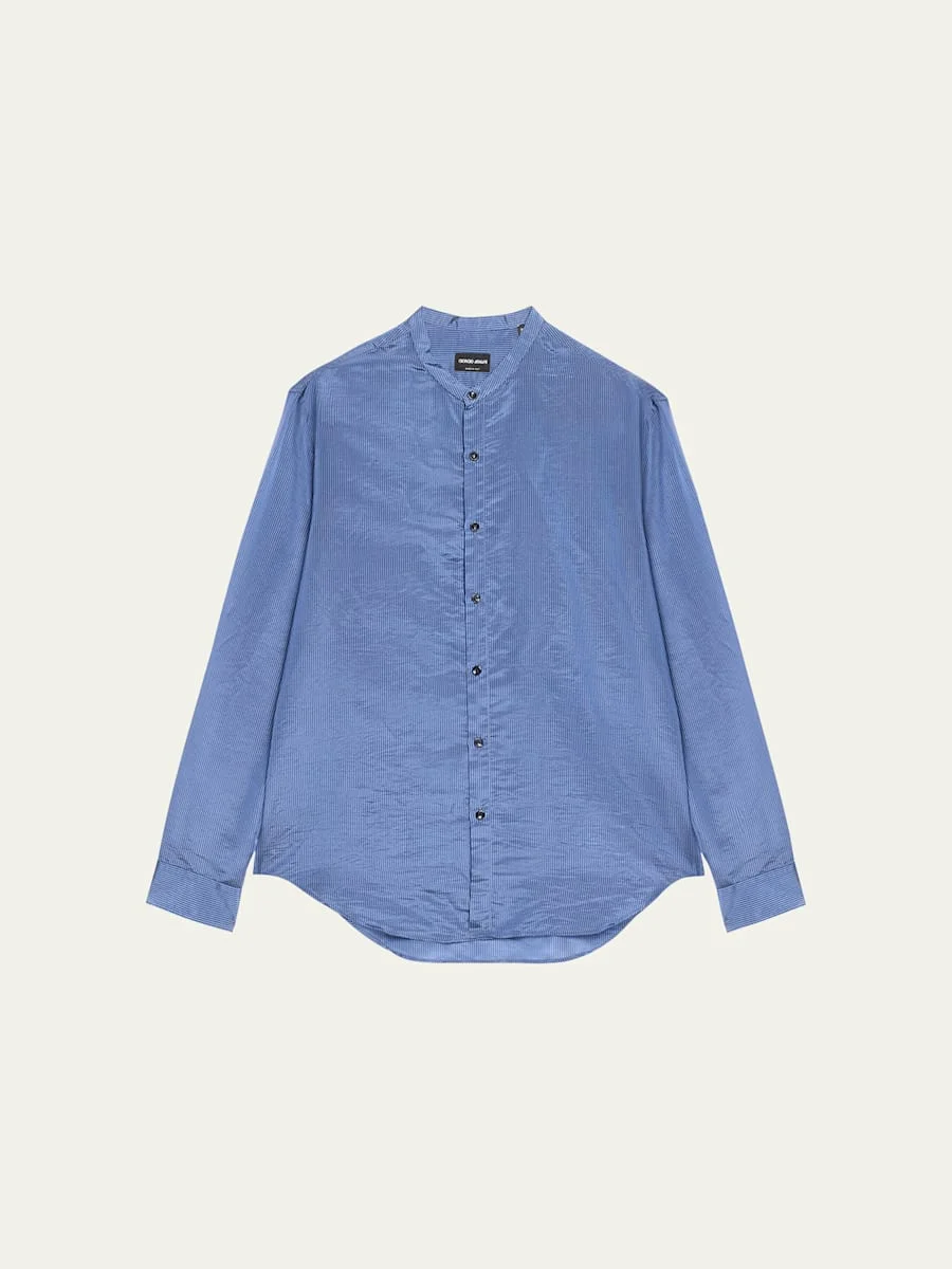 Giorgio Armani sport shirt in micro stripes Band collar Button front closure Long sleeves with squared barrel cuffs Yoked back shoulders Shirttail hem Silk Dry clean Made in Italy