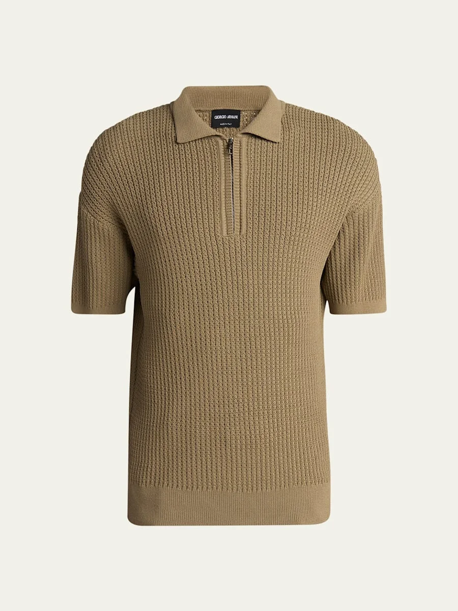 Giorgio Armani polo sweater in a textured viscose blend Spread collar Quarterzip neckline Short sleeves Ribbed cuffs and hem Pullover style Viscose/polyester Made in Italy