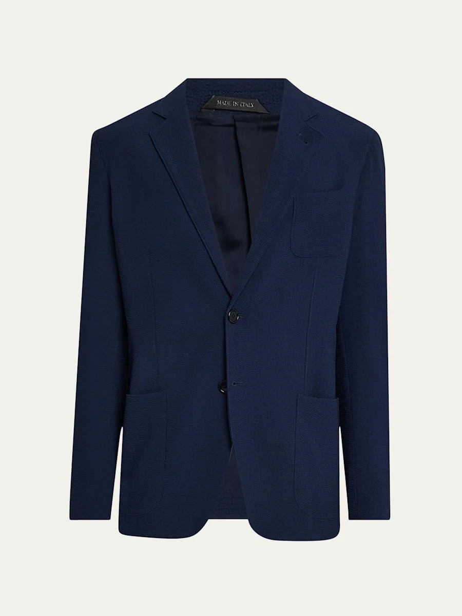 Giorgio Armani "Upton" sport coat in solid seersucker Notched lapels Twobutton closure Chest and hip patch pockets Fourbutton sleeve finish Virgin wool/elastane Dry clean Made in Italy