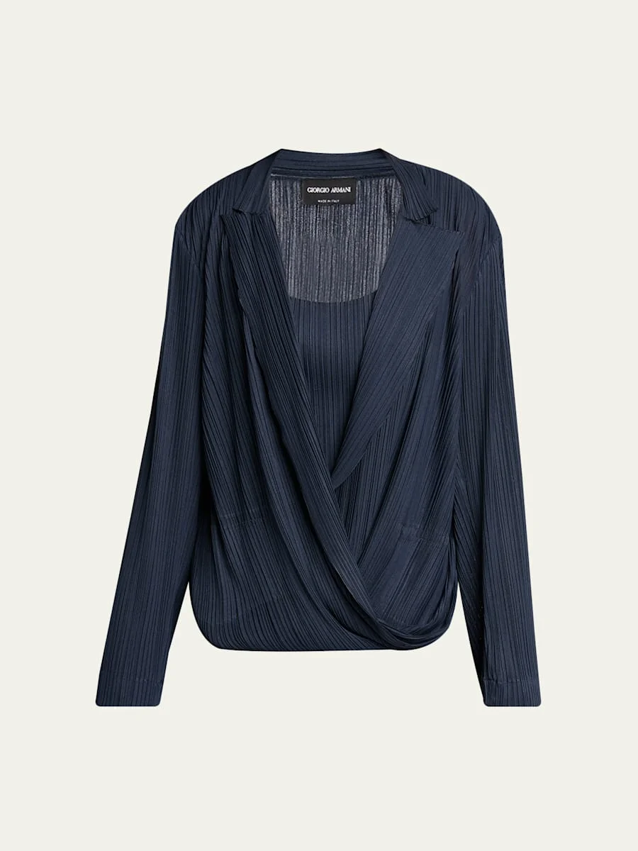 Crafted from plisse jersey, this top from Giorgio Armani features a draped crossover front layered atop a matching tank top Nothc lapels; surplice front Long sleeves Front patch pockets Loose fit Hem falls below the hip Pullover style Polyester Dry clean Made in Italy