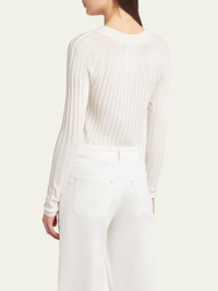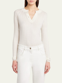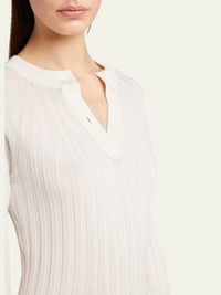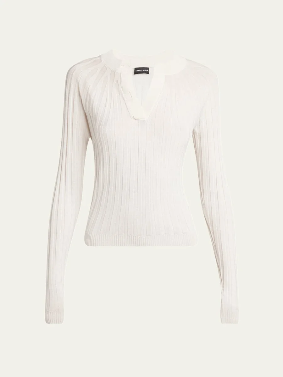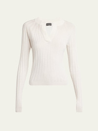 Giorgio Armani ribbed knit top V neckline Button closure Long sleeves Slim fit Pullover style Cashmere/silk Dry clean Made in Italy Online Inquiries: BGS21_T6R9Q| Store Inquiries: #5025059