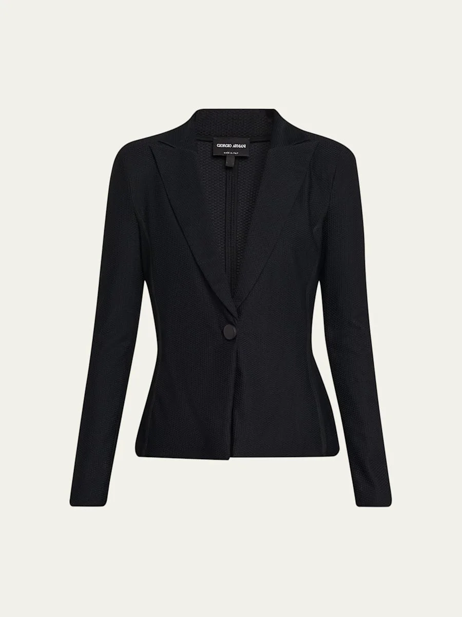 Giorgio Armani jacket in rice stitch jersey Peak lapels; single-breasted front Long sleeves Slim fit Button closure Nylon/polyamide/elastane Dry clean Made in Italy Online Inquiries: BGS21_BA4YC| Store Inquiries: #5037476
