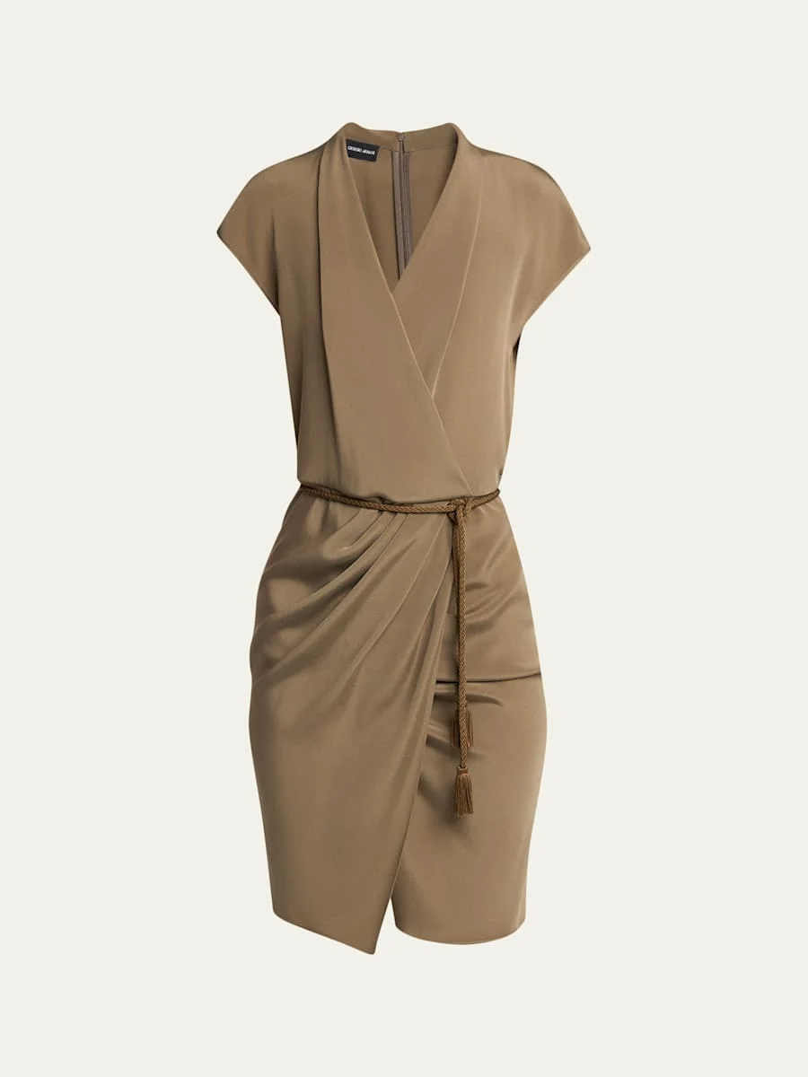 Giorgio Armani dress is crafted from stretch silkblend accented with a faux wrap draped front and cinched at the waist with a braided rope belt with tassel ends Surplice neckline Short sleeves Belted waist Sheath silhouette Knee length Invisible back zip Acetate/silk/elastane Dry clean Made in Italy