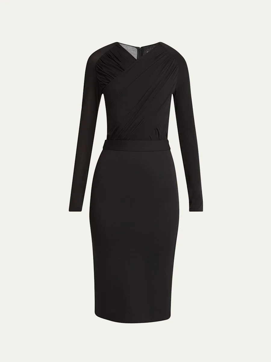 Giorgio Armani jersy dress featuring a crossover ruched bodice V neckline Long raglan sleeves Bodyskimming silhouette Hem falls below the knee Vented hem Back zip Lyocell/silk/cotton Dry clean Made in Italy