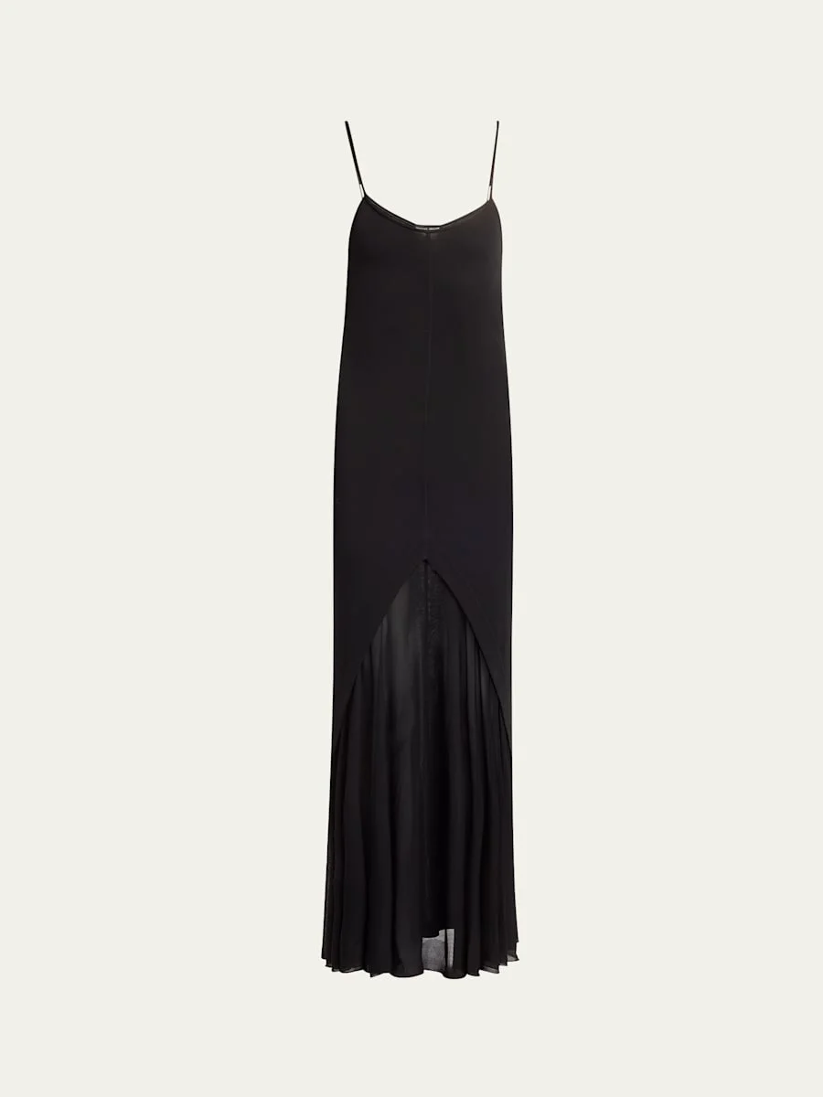 Giorgio Armani jersey dress with a sheer skirt panel cut from fitted fabric with a daring touch of transparency Scoop neckline Adjustable straps Bias-cut silhouette Falls below the ankle Slip-on closure Viscose Dry clean Made in Italy Online Inquiries: BGS21_T6R9V| Store Inquiries: #5025067