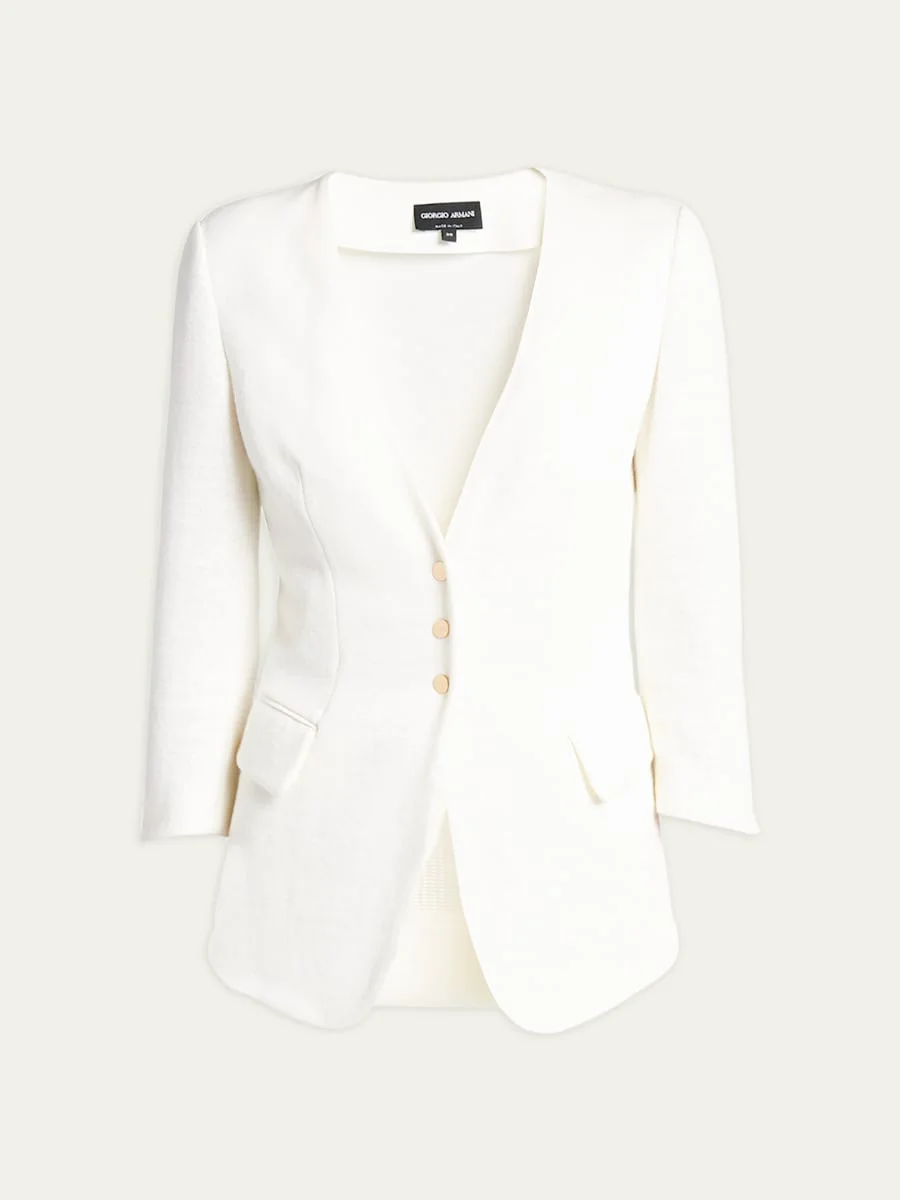 Giorgio Armani blazer with back strap V neckline; snap button front Three-quarter sleeves Side flap pockets Cutaway hem Viscose/lyocell/cotton Lyocell lining Dry clean Made in Italy Model is 5'10"/177cm. Online Inquiries: BGS21_B8Y4M| Store Inquiries: #4690313