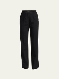 Giorgio Armani tuxedo pants Approx. 28" inseam High rise Flat front Side slip pockets Wide legs Full length Hook/zip fly Viscose/spandex/silk Dry clean Made in Italy Model is 5'10"/177cm. Online Inquiries: BGS21_B6VDL| Store Inquiries: #4208208