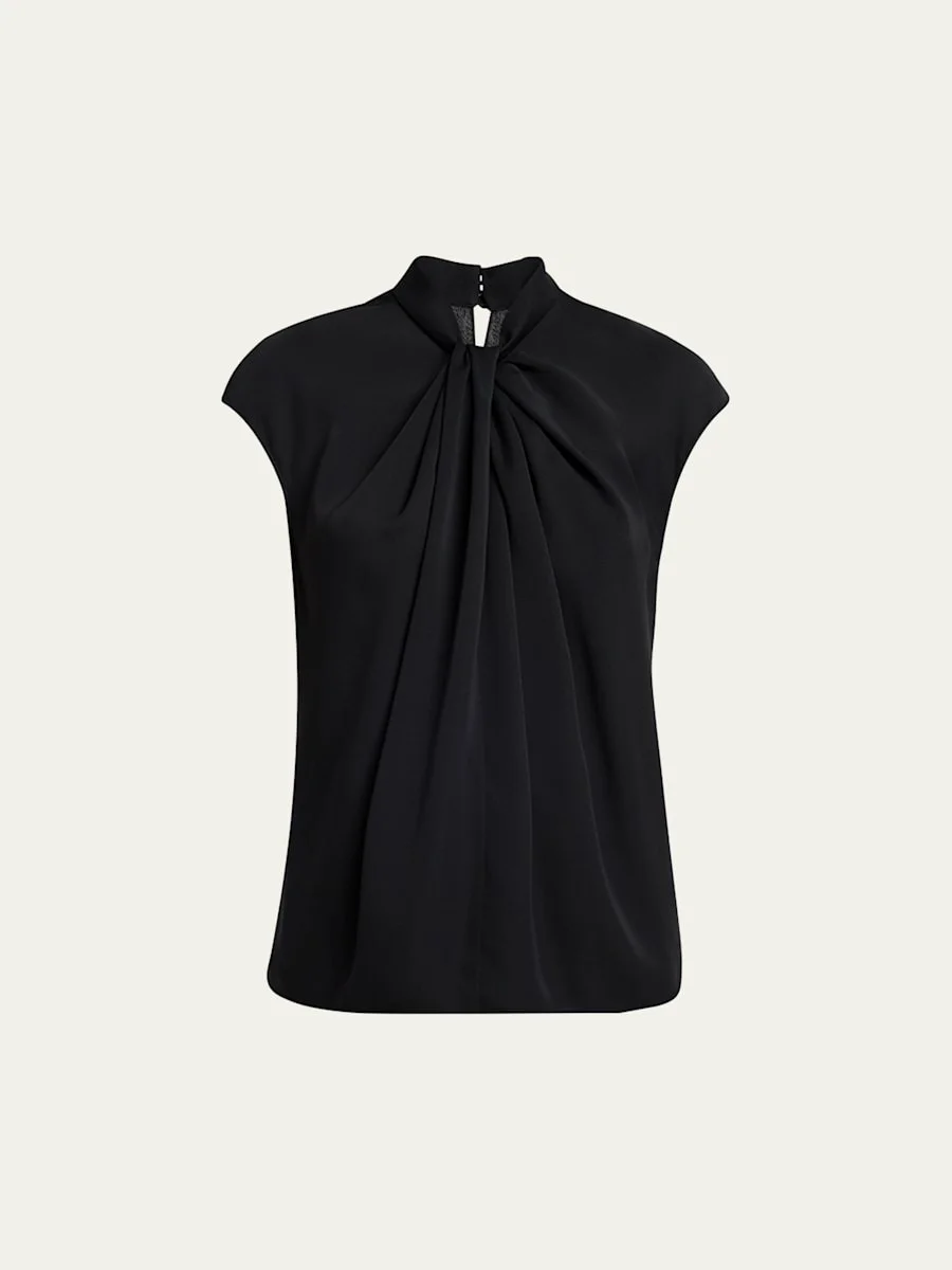 Giorgio Armani silk georgette blouse featuring a twisted neck detail High neckline Cap sleeves Relaxed fit Button/keyhole back Silk Dry clean Made in Italy Online Inquiries: BGS21_T68SF| Store Inquiries: #4932048