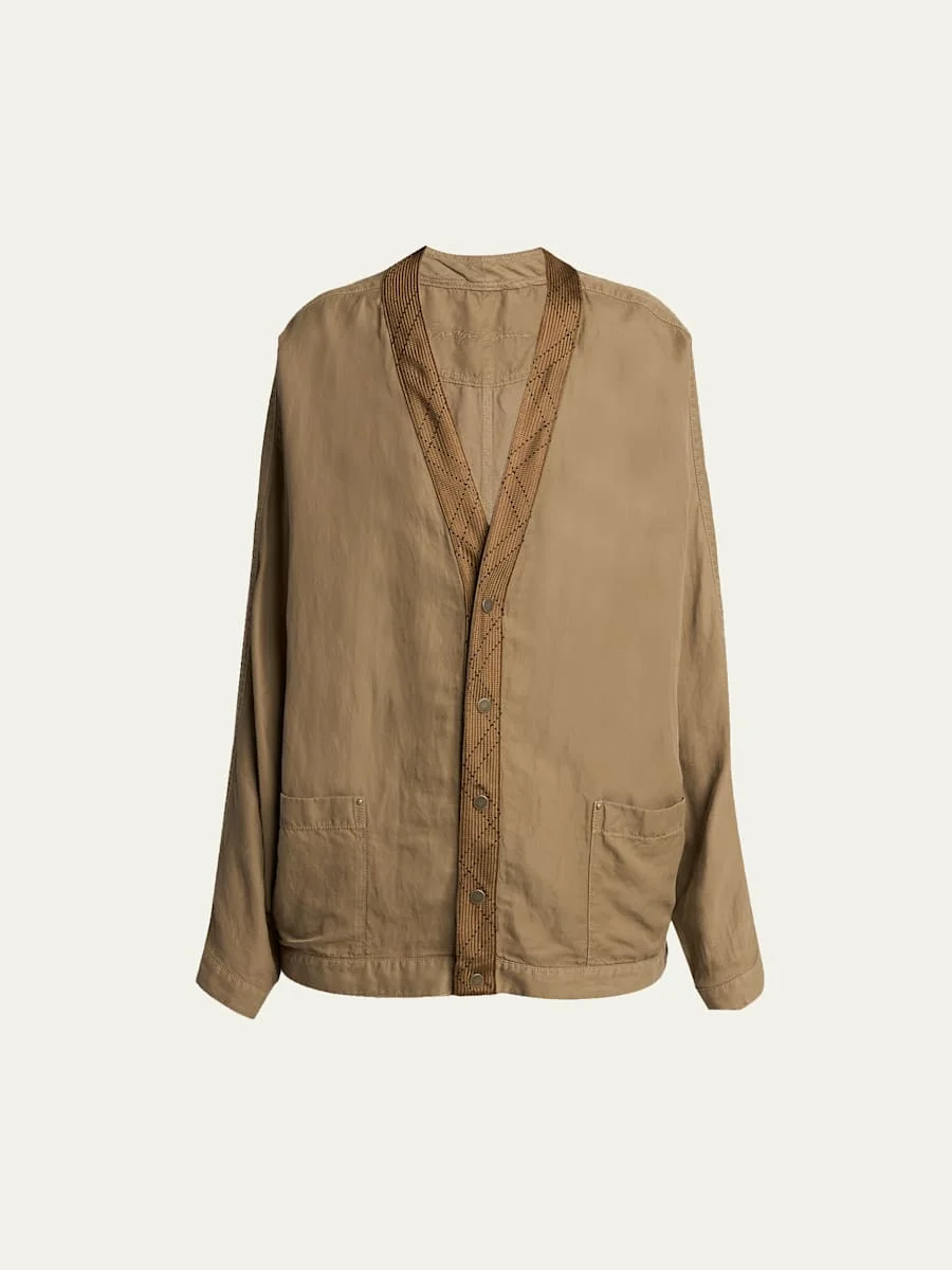 Crafted from technical cupro, this utility jacket from Giorgio Armani features geo braided tape along the neckline and placket V nekcline; singlebreasted front Long sleeves Drop shoulders Hip patch pockets Oversized fit Hem falls below the hip Snapbutton closure Cupro Dry clean Made in Italy