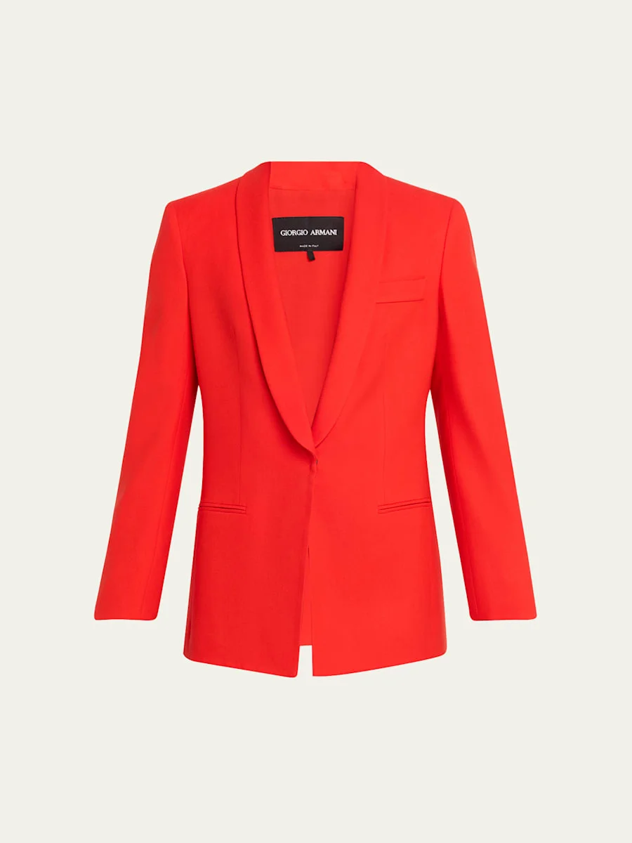 Tailored from virgin wool suiting, this blazer by Giorgio Armani features a longline silhouette and a cutaway back vent Shawl collar Padded shoulders Chest welt pocket Hip besom pockets Virgin wool Dry clean Made in Italy