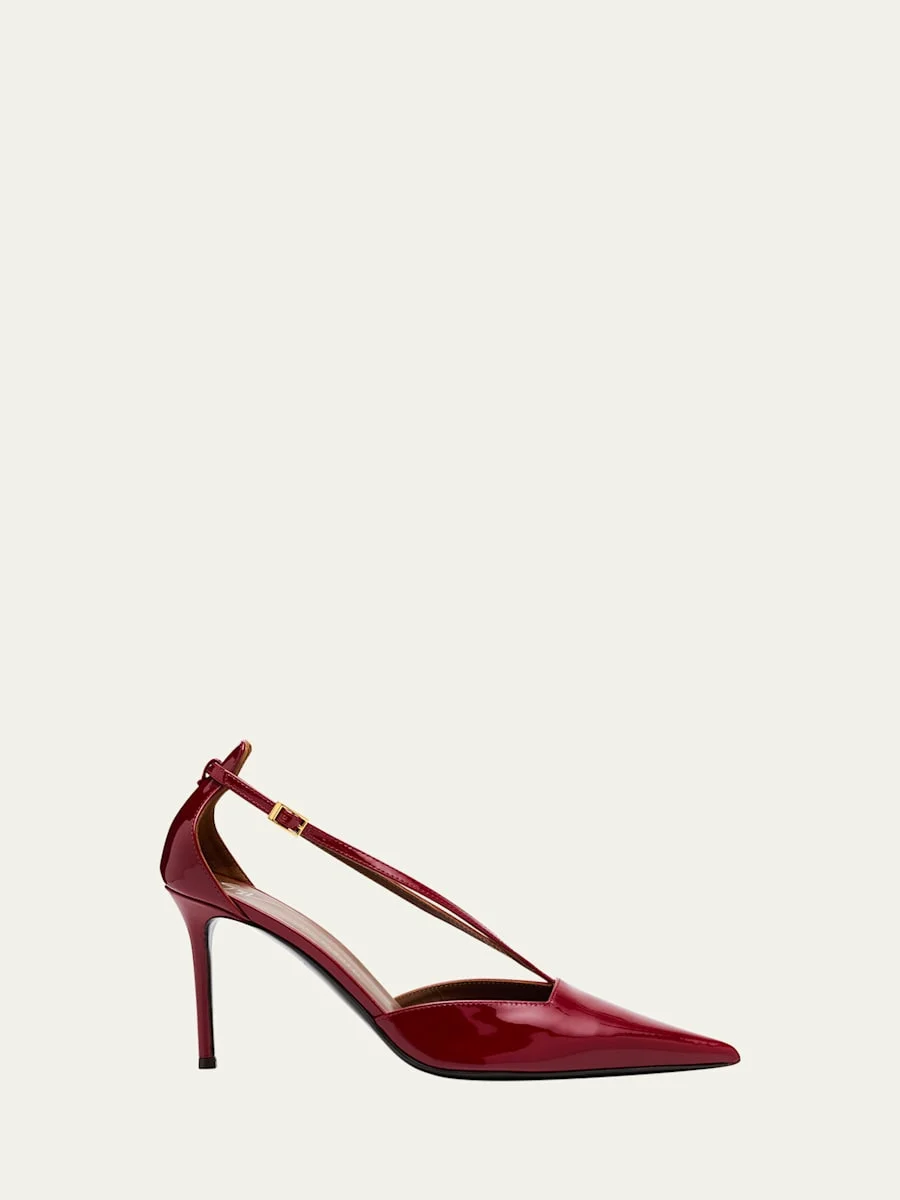 Giuseppe Zanotti pumps in shiny patent calf leather with a Y-shaped upper 3.25 in / 85 mm covered stiletto heel Pointed toe Buckle ankle strap Leather lining and outsole Made in Italy Online Inquiries: BGS21_X6V86| Store Inquiries: #4990910