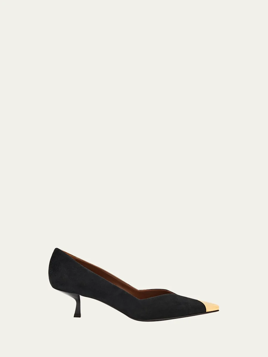 Embellished with a shiny gold cap toe, these pumps by Giuseppe Zanotti are crafted from supple calf suede 2.00 in / 50 mm covered kitten heel Pointed toe Slip-on style Leather lining and outsole Spot clean Made in Italy Online Inquiries: BGS21_X6WED| Store Inquiries: #5022409