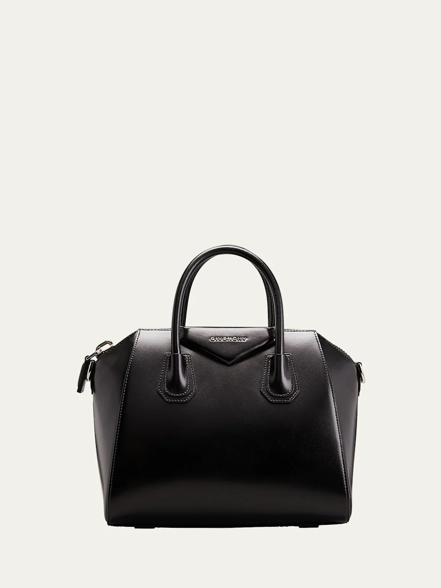 Givenchy shiny calfskin satchel bag with shiny palladium hardware. Rolled tote handles, 3.5" drop. Flat shoulder strap, 13.4" drop. Extended zip top closure. Envelope flap detail with metal logo lettering. Interior, cotton lining; one zip pocket and two open pockets. Feet protect bottom of bag. 9"H x 10.5"W x 6.5"D. "Antigona" is made in Italy. Online Inquiries: BGS21_V38FW| Store Inquiries: #46689