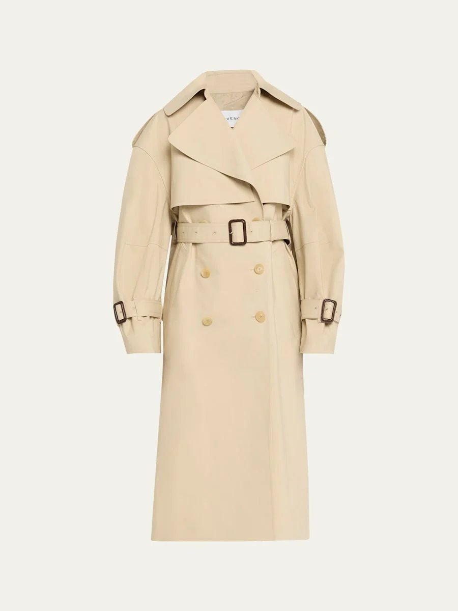 Classic tailoring meets sculptural silhouettes with this Givenchy cocoon trench coat featuring a cocoon-like blouson back cinched with a belted waist Trench collar with throat latch; double-breasted front Long sleeves; belted cuffs Shoulder epaulets Chest gun flaps; rain shield back Belted waist Hip welt pockets Oversized fit Hem falls below the knee Side slits Cotton Made in Portugal Online Inquiries: BGS21_BAAW8| Store Inquiries: #5070008