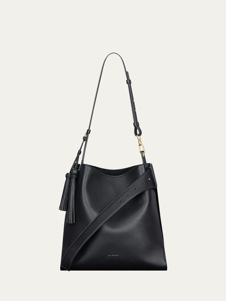 Givenchy "Day" slightly slouchy hobo bag crafted in smooth leather with gold-foiled logo lettering and contrast tassels Adjustable shoulder strap Open top with self-tie straps Interior, one slip pocket Approx. 12.2"H x 12.6"W x 4.7"D Made in Italy Online Inquiries: BGS21_V6JXR| Store Inquiries: #5024793