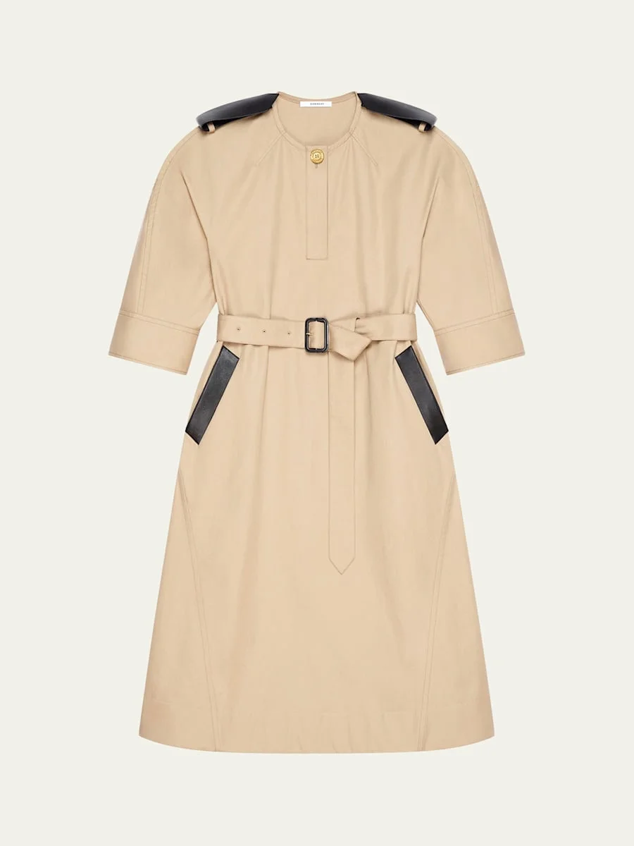 Givenchy cotton twill coocon dress featuring calf skin leather shoulder epaulets and pockets High neckline; quarter button placket 3/4 raglan sleeves; button cuffs Belted waist Hip welt pockets A-line silhouette Hem falls below the knee Slipover style Cotton Made in Italy Online Inquiries: BGS21_BA3FT| Store Inquiries: #5024767