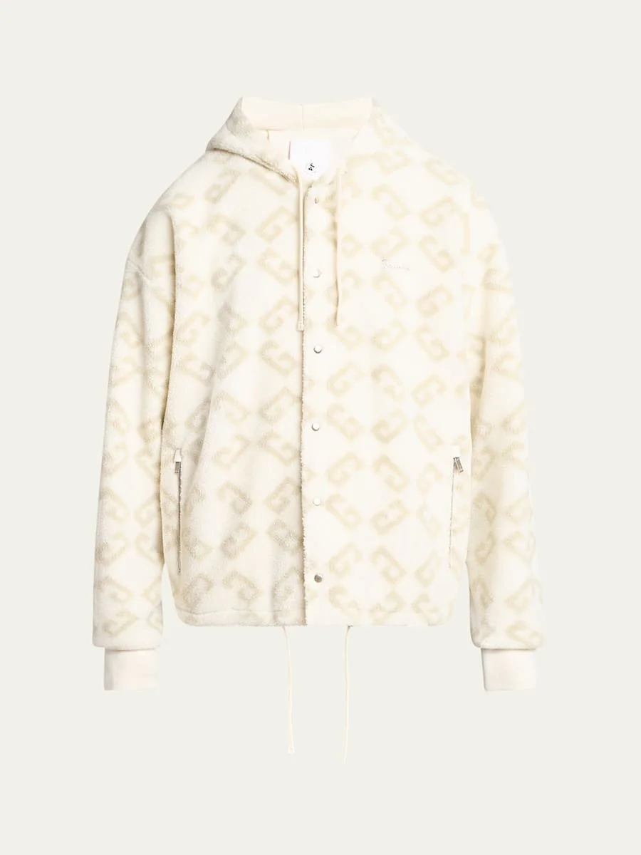 Givenchy fleece jacket with allover 4G monogram print Drawstring hood and hem Snap front closure Side zip pockets Relaxed fit Long sleves Banded cuffs Polyester/acrylic Made in Portugal Online Inquiries: BGS21_ND0NN| Store Inquiries: #4990877
