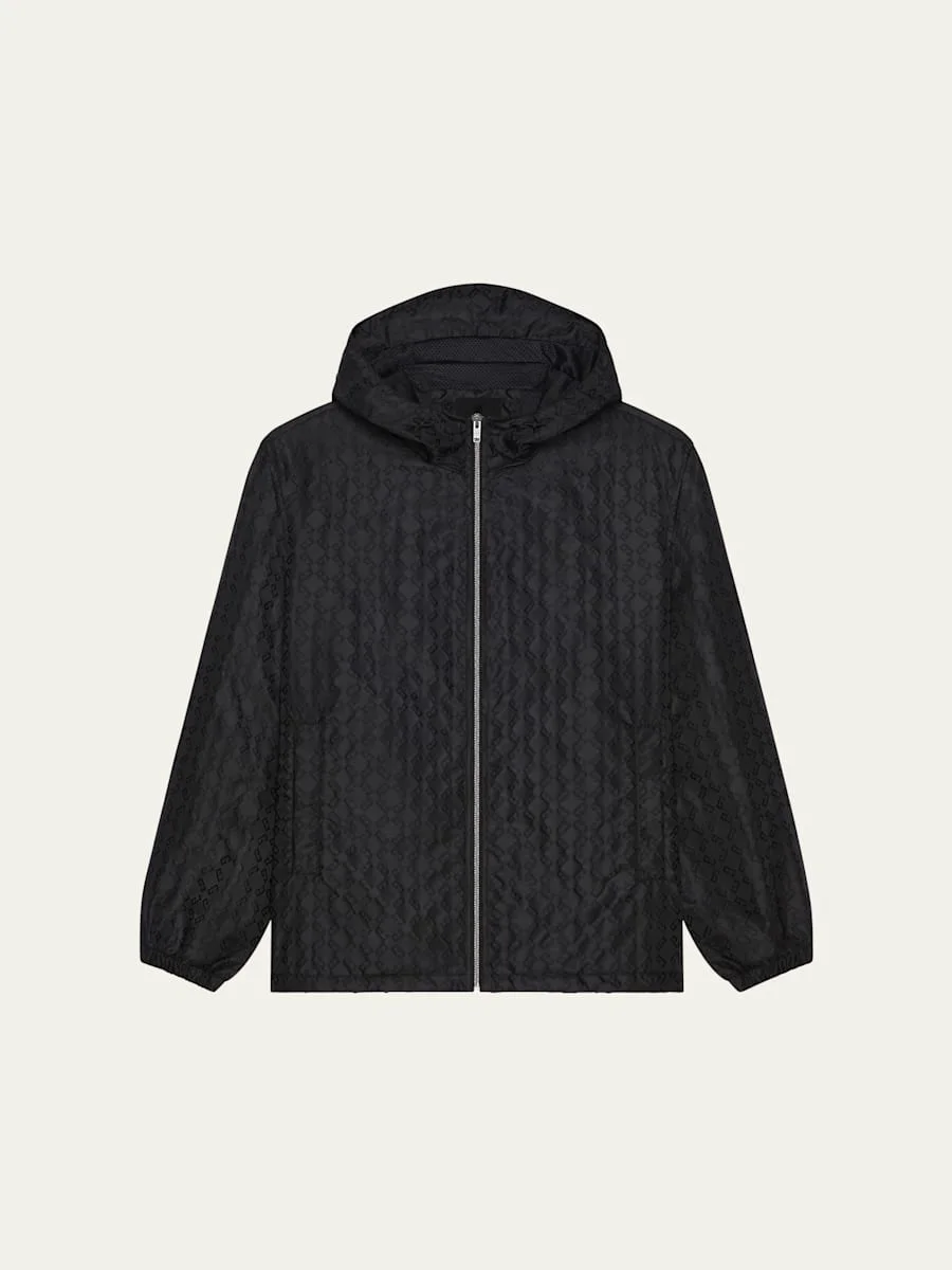 Givenchy jacket crafted of wind-resistant nylon Allover tonal 2G pattern Hooded neckline Zip closure Welt pockets Long sleeves Elasticized cuffs Made in Romania Model is 6'1"/185cm. Online Inquiries: BGS21_NCDU7| Store Inquiries: #4863237