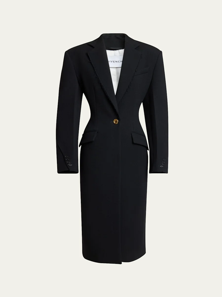 Elevated with a tailored cocoon-shaped silhouette, this coat by Givenchy is crafted from a cozy wool blend with raw-edge trim Notched lapels; single-button front Padded shoulders Long sleeves; button cuffs Single chest welt pocket Hip flap pockets Center-cut back vent Hem falls below the knee Wool/nylon/polyamide/viscose Made in Italy Online Inquiries: BGS21_BAAHF| Store Inquiries: #5068054