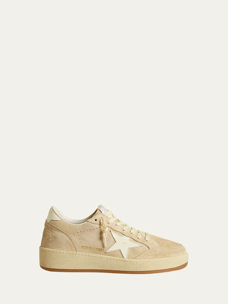 Golden Goose "Ball Star" matte and suede lowtop sneakers Features signature star logo on the side Flat heel Round toe Laceup vamp Signature stained rubber outsole Lining: Cotton/leather/polyester/polyurethane/viscose Made in Italy