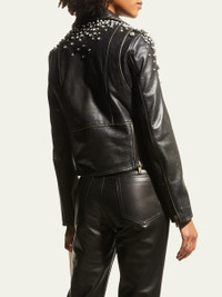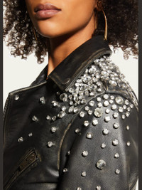 Golden Goose jacket in distressed leather with crystal stones Notched lapels Off-center zip front Long sleeves; zipper cuffs Zipper pockets; flap pocket Belted waist Slim fit Calf leather Lining: Polyester Leather method dry cleaning Made in Italy Model is 5'10"/177cm. Online Inquiries: BGS21_T2J21| Store Inquiries: #4178312