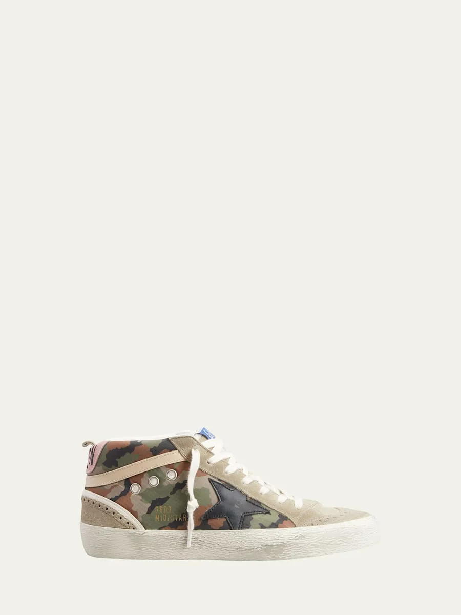 Golden Goose midtop sneakers in camoprint ripstop fabric, suede and leather. Signature star at side. Flat heel. Round wingtip toe. Laceup vamp. Logo patch at tongue. Breathable leather/cotton lining. Signature stained rubber sole. Made in Italy.