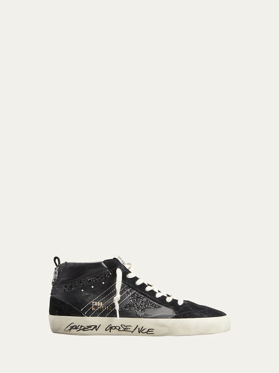 Golden Goose mid-top sneakers in suede, leather, fabric and glitter. Signature star at side. Flat heel. Round wing-tip toe. Lace-up vamp. Logo patch at tongue. Breathable leather/cotton lining. Signature stained rubber sole. Made in Italy. Online Inquiries: BGS21_X5ZME| Store Inquiries: #4443304