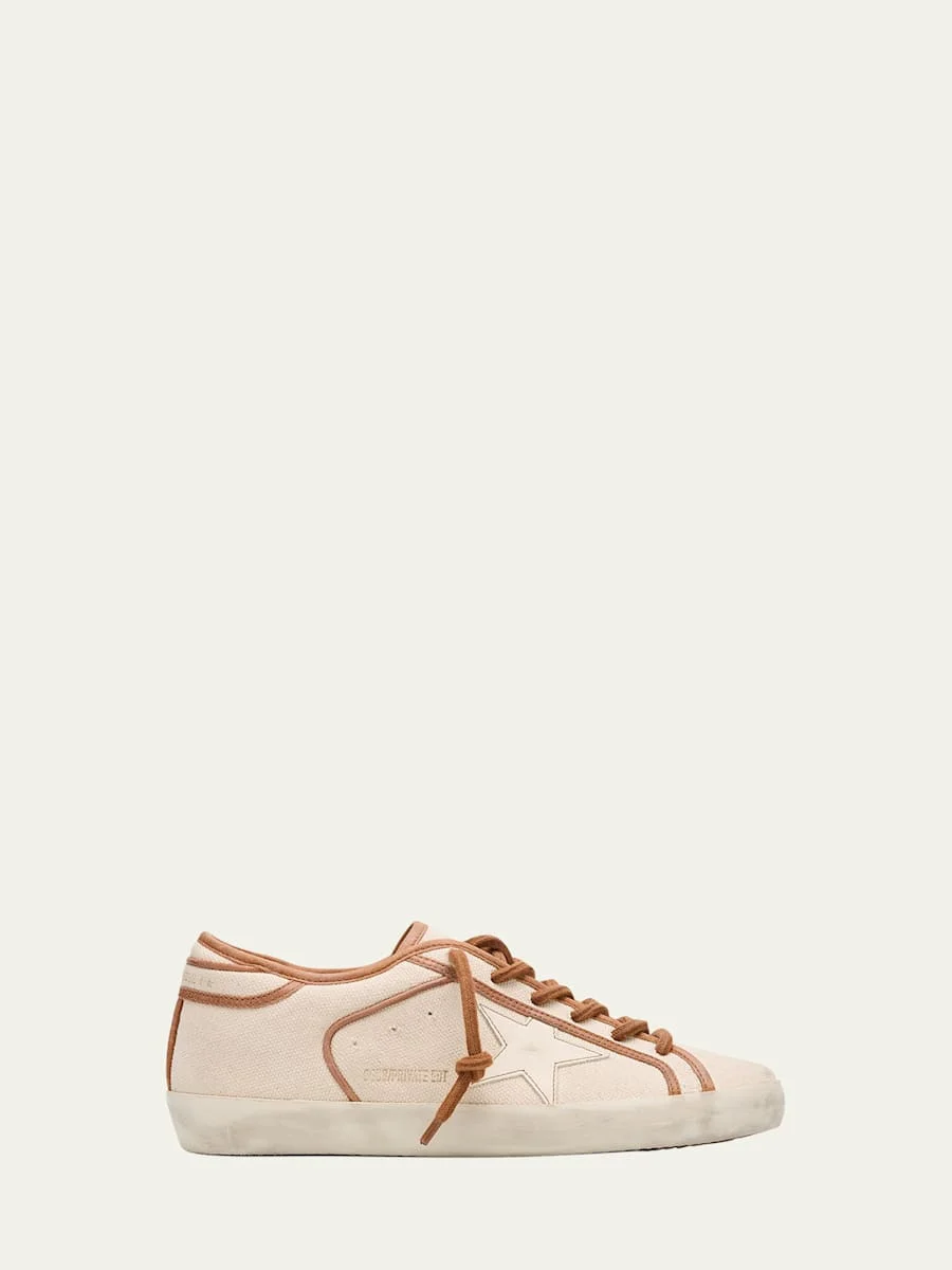 Golden Goose lowtop canvas sneakers with contrast leather piping. Star patch at side. Flat heel. Round toe. Laceup vamp. Breathable leather/cotton lining. Signature handstained rubber sole. Made in Italy.