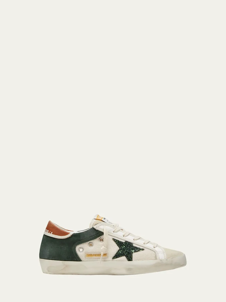 Golden Goose lowtop sneakers in suede, leather, net mesh fabric and glitter. Signature contrast star at side. 1" flat heel. Round toe. Laceup vamp. Logo at tongue. Cushioned footbed. Breathable leather/cotton lining. Signature stained rubber outsole. Made in Italy.