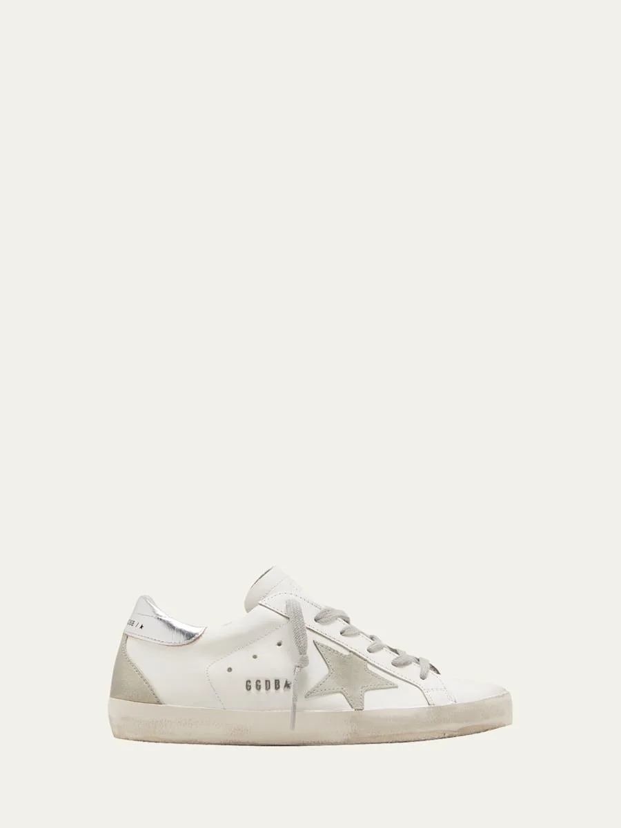 Golden Goose lowtop leather sneakers with suede and metallic trim. Contrasting star patch at side. Flat heel. Round toe. Laceup vamp. Breathable leather/cotton lining. Signature handstained rubber sole. Made in Italy.