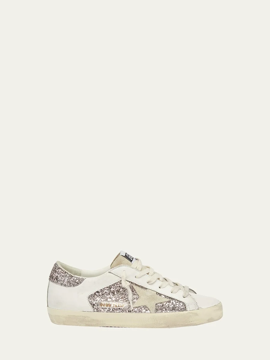 Golden Goose lowtop glitter, leather and suede sneakers. Contrasting star patch at side. Flat heel. Round toe. Laceup vamp. Breathable leather/cotton lining. Signature handstained rubber sole. Made in Italy.