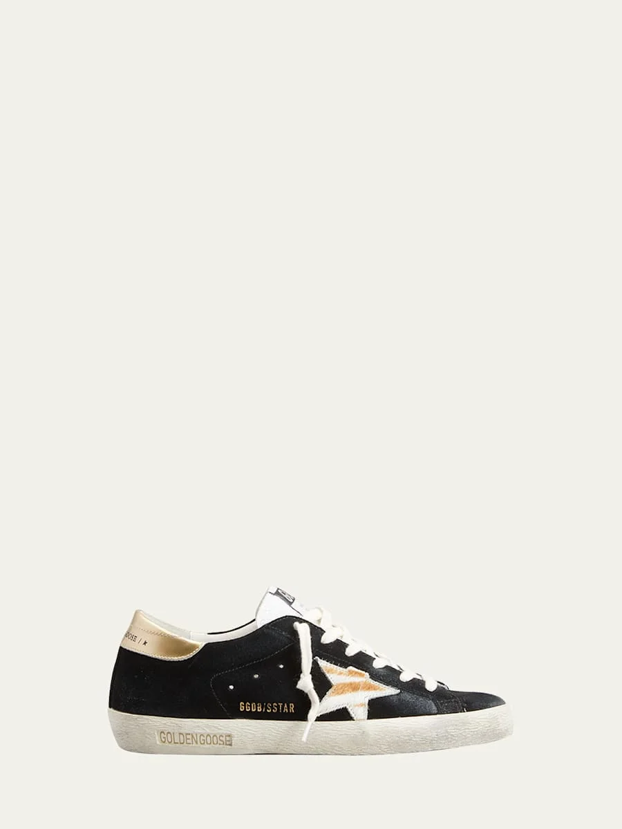 Golden Goose leather and suede lowtop sneakers with zebraprint calf hair (Italy) trim. Contrasting star patch at side. Flat heel. Round toe. Laceup vamp. Breathable leather/cotton lining. Signature handstained rubber sole. Made in Italy.