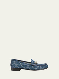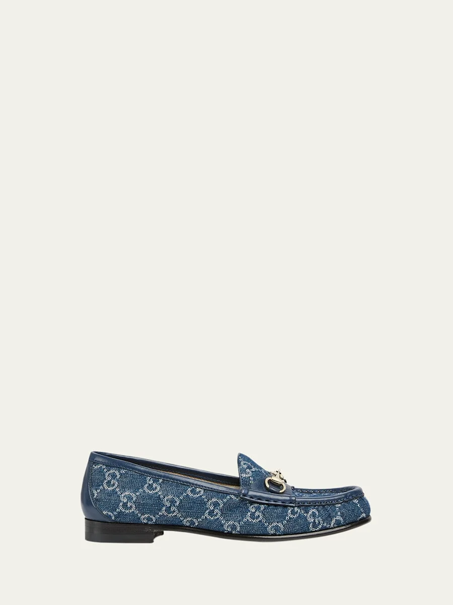 Gucci "1953" loafers in GG monogram denim cotton and leather 0.25 in / 10 mm flat heel Round toe Notched vamp; horsebit accent Slipon style Leather outsole Spot clean, professional cleaning recommended Made in Italy