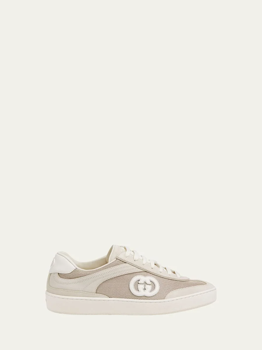 Gucci fabric sneakers with tonal leather and suede overlays 0.25 in / 10 mm flat heel Signature interlocking G details Lace-up vamp Rubber outsole Spot clean, professional cleaning recommended Made in Italy Online Inquiries: BGS21_X6S7A| Store Inquiries: #4927707