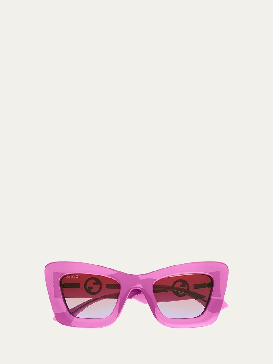 Gucci "GG1552S" cateye sunglasses in plastic Lens/bridge/temple (in mm): 4923140 Gradient lenses; logo on corner GG on temples Wide, tapered arms 100% UVA/UVB protection Made in Japan