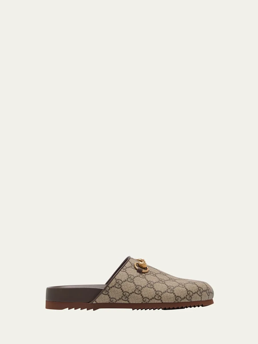 Gucci mule slippers in GG Supreme canvas Flat heel Round toe Goldtoned horsebit hardware Slide style Rubber outsole Made in Italy