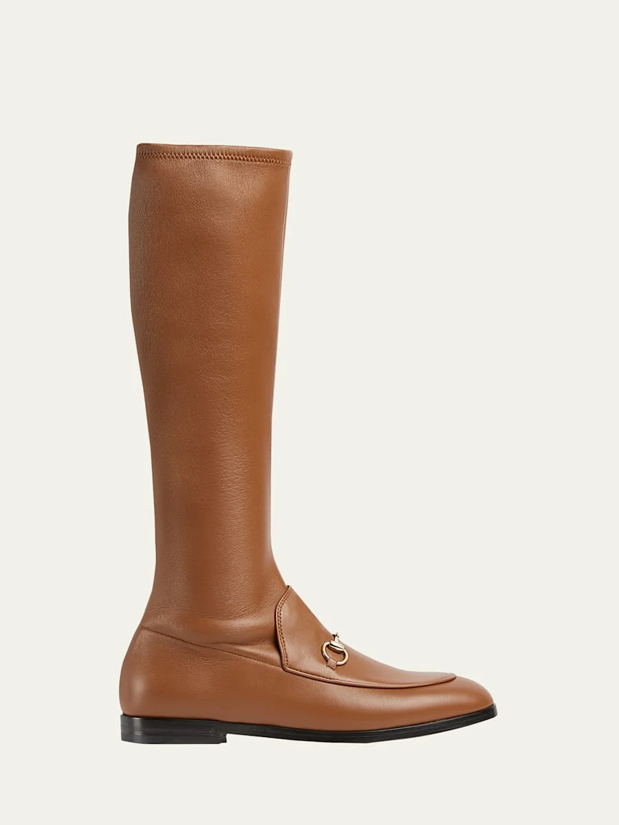 Gucci "Jordaan" knee-high boots reinterpret the house's signature loafer with a soft stretch nappa leather shaft, offering comfort and elegance. Part of the spring/summer 2025 collection 0.50 in / 15 mm flat heel Round apron toe Side zip eases dress Leather outsole Lining: Leather Professional cleaning recommended, spot clean Made in Italy Online Inquiries: BGS21_X6VSP| Store Inquiries: #5000145