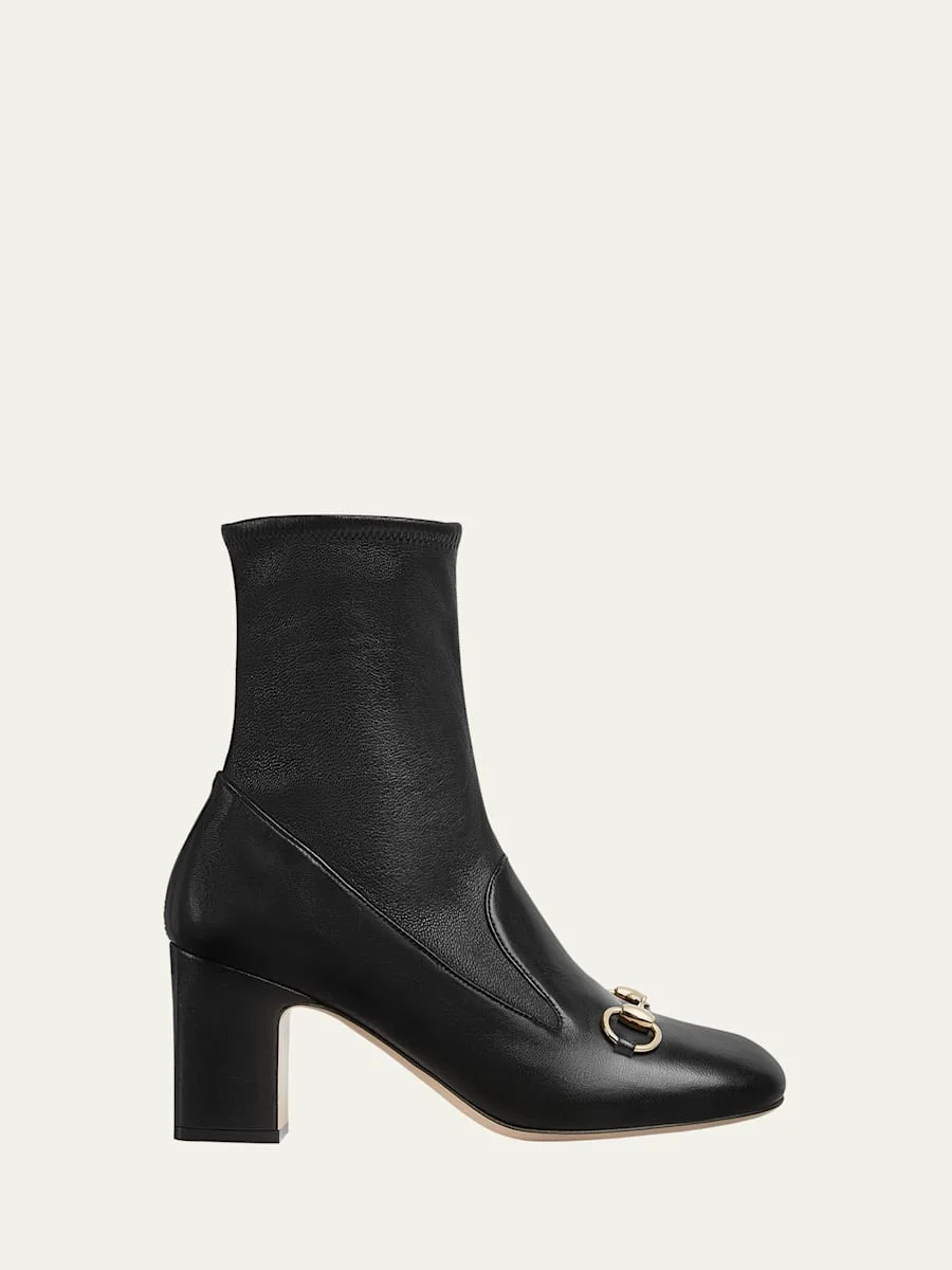 Gucci "Lady" leather loafer booties with horsebit strap 3.00 in / 75 mm block heel Round toe Notched vamp detail Pull-on style Leather outsole Lining: Leather Made in Italy Online Inquiries: BGS21_X6NA0| Store Inquiries: #4842618