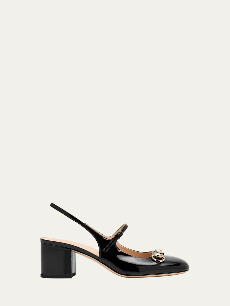 Gucci "Lady" patent leather pumps with bit strap accent 2.25 in / 55 mm block heel Round toe Mary Jane buckle strap Stretch slingback strap Leather outsole Lining: Leather Made in Italy Size Note: Runs true to size. Online Inquiries: BGS21_X6NAE| Store Inquiries: #4842634