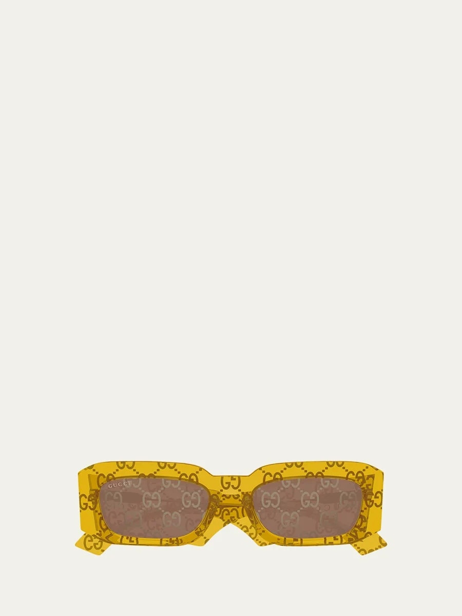Gucci "GG1426SM" rectangle sunglasses in acetate feature an allover GG logo pattern Lens/bridge/temple (in mm): 54-19-145 Right lens logo script Saddle nose bridge Thick, tapered arms Exposed metal corewire Curved temple tips Acetate 100% UVA/UVB protection Made in Italy Proposition 65 warning for California residents Online Inquiries: BGS21_NCWL8| Store Inquiries: #4965533