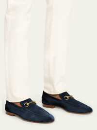Gucci "Jordaan" loafers in supple suede Stacked heel Elongated round toe Gold-tone bit hardware Blake construction Leather outsole Slip-on style Made in Italy Online Inquiries: BGS21_NDETG| Store Inquiries: #4327028
