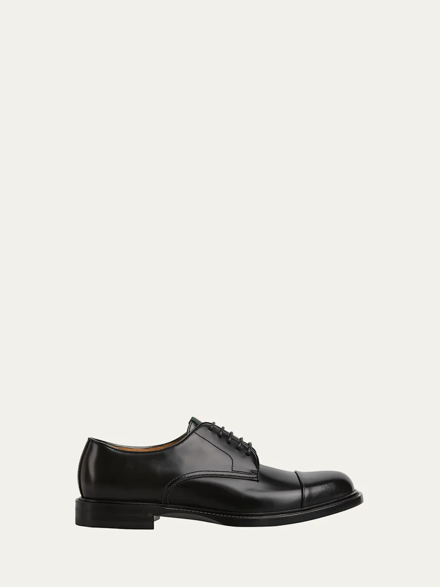 Gucci derby shoes in smooth calf leather defined by a Green and Red web insert on the vamp Stacked heel Round cap toe Lace-up vamp Rubber outsole Made in Italy Online Inquiries: BGS21_NDLFQ| Store Inquiries: #5045077
