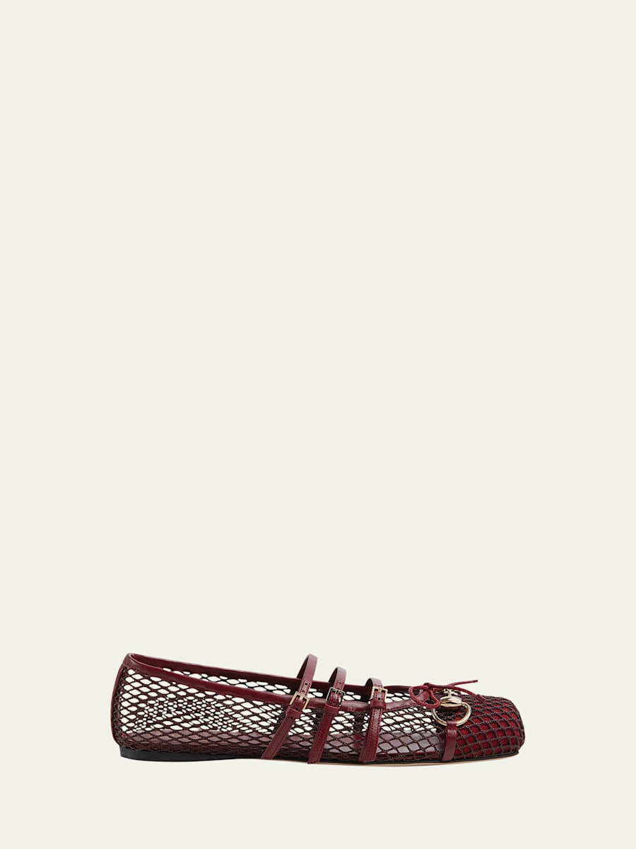 Net Nappa Triple-Strap Horsebit Ballerina Flats